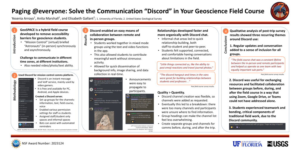 My work with GeoSPACE also included technology management, where I collaborated with Dr. Trevor Collins on the impacts of video streaming and the utilization of modern communication methods on student engagement. As someone who grew up online and with instant messaging, I was excited to conceptualize the use of a social media platform (Discord) in educational field settings, a strategy that is now being emulated by other field programs. We evaluated outcomes through thematic analysis and found that the approach can enable strong bonds across virtual and in-person teams, fostering a sense of community. This culminated in my first scientific poster, presented at the 2022 GSA annual meeting, which explored how digital tools can create equitable field experiences. I am currently writing a first-author paper centered on how using Discord helps establish and maintain relationships similar to those found in other communities of learning, thereby contributing to the development of a geoscience identity in students.