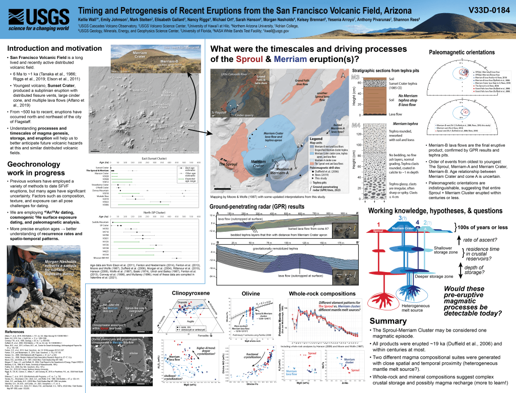 Through the NSF GEO-REPS program, I joined a team of scientists from the Cascades and Hawaii Volcano Observatories (CVO and HVO, respectively) to conduct research in the San Francisco Volcanic Field (SFVF) in Arizona in May 2023. Our goal was to constrain the age of several overlapping lava flows at Merriam Crater and the Sproul spatter rampart using paleomagnetism, sample collection, and ground-penetrating radar (GPR). As part of the GPR team, I helped collect subsurface data that revealed a previously unrecognized buried lava flow. I later visited CVO to analyze thin sections of the collected samples using petrographic and scanning electron microscopy techniques to identify any unusual occurrences, such as a specific clinopyroxene xenocryst with a core and crust of different compositions.